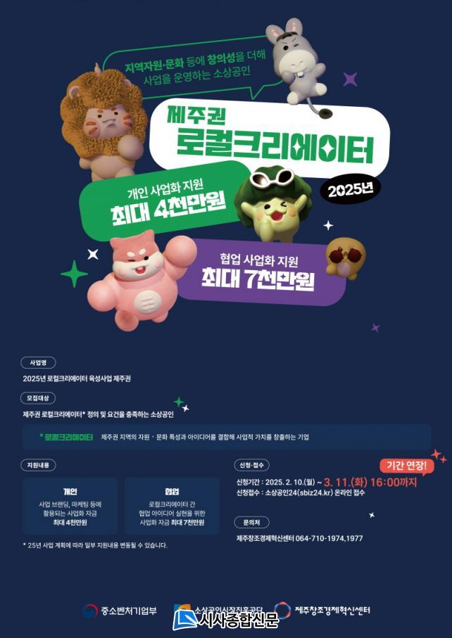 ¿ÃÇØ Á¦ÁÖ¼¾ÅÍ´Â ·ÎÄÃÅ©¸®¿¡ÀÌÅÍ 31°³»ç(ÆÀ)¸¦ Áö¿øÇÑ´Ù. °³ÀÎ 28°³ÆÀ, Çù¾÷ 3°³ÆÀÀ» Áö¿øÇÒ °èȹÀ̸ç, ¼·ù ¹× ¹ßÇ¥ Æò°¡¸¦ °ÅÃÄ ÇÕ°ÝÇÑ °³ÀÎ ¼Ò»ó°øÀÎÀº ÃÖ´ë 4,000¸¸¿ø, Çù¾÷ÆÀÀº ÃÖ´ë 7,000¸¸¿øÀÇ »ç¾÷È Áö¿ø±ÝÀ» ¹ÞÀ» ¼ö ÀÖ´Ù.