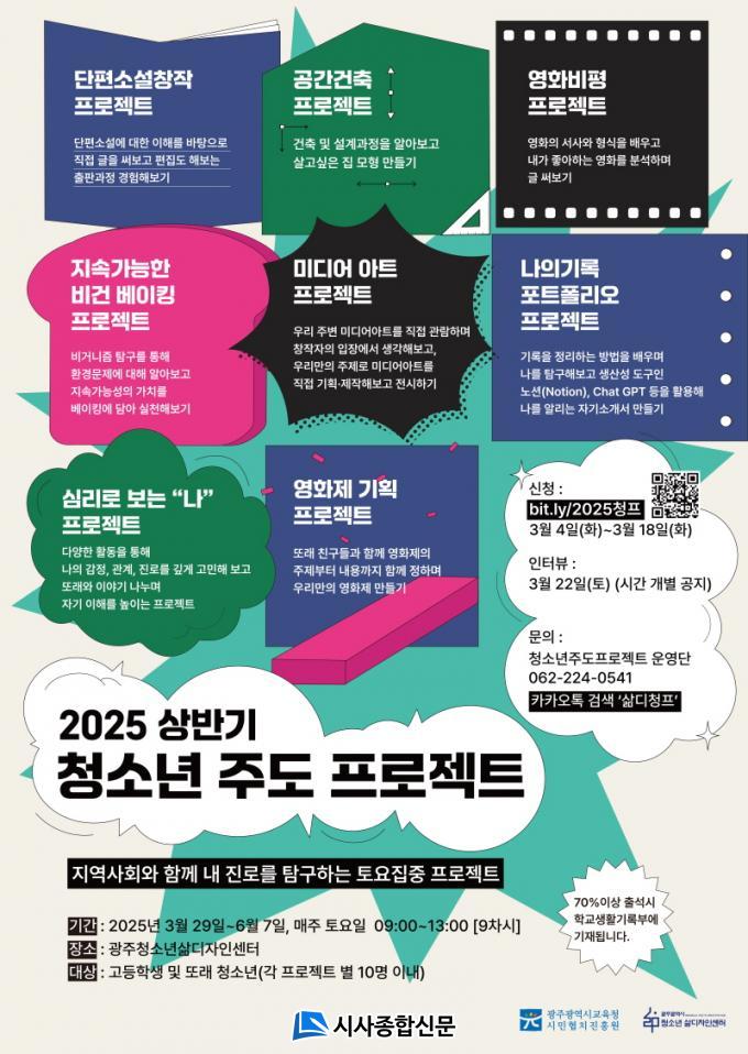 ¡®Ã»¼Ò³â ÁÖµµ ÇÁ·ÎÁ§Æ®¡¯´Â ½Ã¹ÎÇùÄ¡ÁøÈï¿ø°ú ±¤ÁÖû¼Ò³â »î µðÀÚÀμ¾ÅͰ¡ Çù·ÂÇØ ¿î¿µÇϰí ÀÖ´Â ÇÁ·Î±×·¥À¸·Î, û¼Ò³âµéÀÌ °ü½É ÀÖ´Â ÇÁ·ÎÁ§Æ®¸¦ ¼±ÅÃÇϰí Àü¹®°¡ÀÇ µµ¿òÀ» ¹Þ¾Æ ÁÖµµÀûÀ¸·Î °á°ú¹°À» µµÃâÇÏ´Â ¹æ½ÄÀ¸·Î ¿î¿µµÈ´Ù. Âü¿© ´ë»óÀº °íµîÇлý ¹× Çб³¹Ûû¼Ò³â µî ¶Ç·¡ û¼Ò³âÀÌ´Ù.
