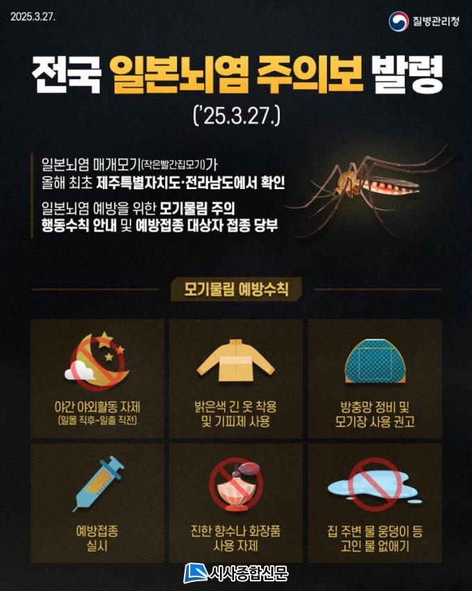 ±¤Áֽô ÀϺ»³ú¿° ¿¹¹æÀ» À§ÇØ ±¹°¡ ¿¹¹æÁ¢Á¾ Áö¿ø ´ë»óÀÚÀÎ »ýÈÄ 12°³¿ù¿¡¼ ¸¸ 12¼¼ ¾Æµ¿¿¡ Ç¥ÁØ ¿¹¹æÁ¢Á¾ ÀÏÁ¤¿¡ ¸ÂÃç Á¢Á¾ÇÒ °ÍÀ» ±Ç°íÇß´Ù. ÀÌ¿Í ÇÔ²² ¸ð±â°¡ Ȱµ¿ÇÏ´Â 4¿ùºÎÅÍ 10¿ù±îÁö ¸ð±â¹°¸² ¿¹¹æÀ» À§ÇØ °³ÀÎ ¹æ¿ª¼öÄ¢À» öÀúÈ÷ ÁؼöÇØ ÁÙ °ÍÀ» ´çºÎÇß´Ù.