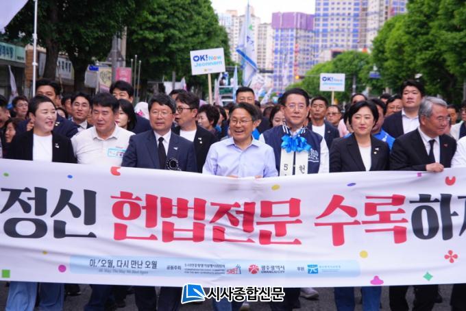 ¹ÎÁÖÆòÈ´ëÇàÁø¿¡´Â °±âÁ¤ ±¤ÁÖ½ÃÀå°ú ¿ì¿ø½Ä ±¹È¸ÀÇÀåÀ» ºñ·ÔÇØ ½Å¼öÁ¤ ±¤ÁÖ½ÃÀÇȸÀÇÀå, ÀÌÁ¤¼± ±¤Áֽñ³À°°¨, ±è¿µ·Ï Àü³²µµÁö»ç, ¿À¿µÈÆ Á¦ÁÖÆ¯º°ÀÚÄ¡µµÁö»ç, ±¤Áֽà ÀÚÄ¡±¸ ûÀå, ±¹È¸ÀÇ¿ø, 5¿ù °ø¹ý´ÜüȸÀå, ´ëÇлý, ½Ã¹Î µî 1¸¸5000¿©¸íÀÌ Âü°¡Çß´Ù.
