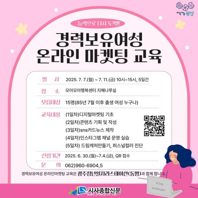 ¿©¼ºµéÀÇ ÀÚÁ¸°¨À» ³ôÀÌ°í »çȸȰµ¿ °æÀï·Â °È¸¦ Áö¿øÇÑ´Ù´Â ¸ñÇ¥·Î ¸¶·ÃÇß´Ù. ÇÁ·Î±×·¥Àº 7¿ù 7ÀϺÎÅÍ 11ÀϱîÁö 5Àϰ£ ¿ÀÀü 10½ÃºÎÅÍ ¿ÀÈÄ 3½Ã±îÁö ¸ð¾Æ¸ð¾ÆÇູ¼¾ÅÍ¿¡¼ ÁøÇàµÈ´Ù. ½ÅûÀº 30ÀϺÎÅÍ °¡´ÉÇϸç, À¥ÀÚº¸ µî¿¡ °ÔÀçµÈ Á¤º¸¹«´Ì(QRÄÚµå)¿¡ Á¢¼ÓÇϰųª ¼¾ÅÍ¿¡ ÀüÈÇØ(062-960-6904, 6905) ÇÒ ¼ö ÀÖ´Ù.