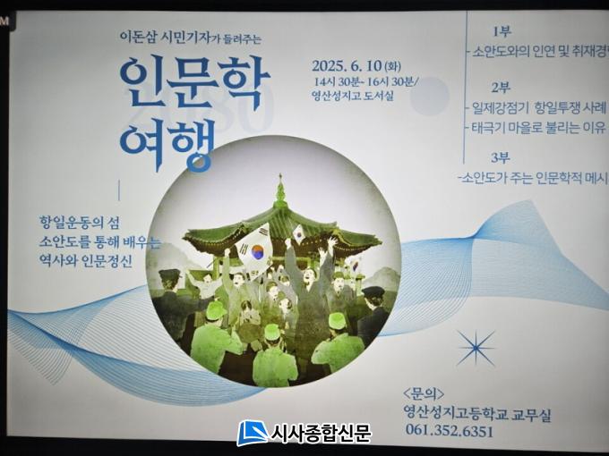 Áö³ 6¿ù 10ÀÏ(È) ¿ÀÈÄ 2½Ã 30ºÐºÎÅÍ 2½Ã°£ µ¿¾È Çб³ µµ¼½Ç¿¡¼´Â ¡®2025 Àι®ÇÐ ¾ÆÄ«µ¥¹Ì¡¯°¡ ¿·È´Ù. À̹ø Ư°Àº ¡®¸¶À½ÀÇ ºúÀ» Áø ¼¶, ¼Ò¾Èµµ – µ¿Çаú Ç×ÀÏÀÇ ¿ª»ç¡¯¸¦ ÁÖÁ¦·Î, Àü³² Áö¿ª¹®È ޹æ Àü¹®°¡ÀÌÀÚ ½Ã¹Î±âÀÚÀÎ À̵·»ï °»ç°¡ ÃÊûµÇ¾î ÁøÇàµÇ¾ú´Ù.