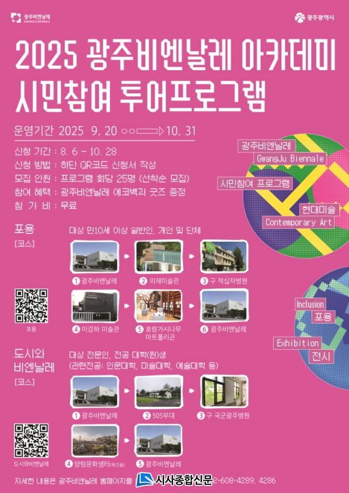 ÀÏ¹Ý ½Ã¹Î»Ó ¾Æ´Ï¶ó ´ëÇлý¡¤´ëÇпø»ýÀ» ´ë»óÀ¸·Î ¸ÂÃãÇü ±³À° ÄÜÅÙÃ÷¸¦ Á¦°øÇØ Çö´ë¹Ì¼ú¿¡ ´ëÇÑ ÀÌÇØµµ¸¦ ³ôÀ̰í, Áö¿ª ¹®È¿¹¼ú±â°ü°úÀÇ Çù·ÂÀ» °ÈÇÒ ¿¹Á¤ÀÌ´Ù. Âü°¡ ºñ¿ëÀº ¹«·áÀ̸ç, ±¤ÁÖºñ¿£³¯·¹ ȨÆäÀÌÁö(www.gwangjubiennale.org)³ª ÀüÈ(062-608-4289)·Î ½ÅûÇÏ¸é µÈ´Ù.