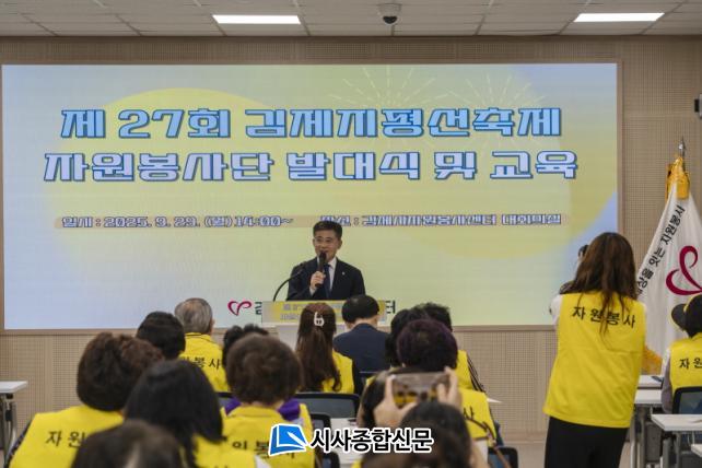 Á¤¼ºÁÖ ±èÁ¦½ÃÀåÀº °Ý·Á»ç¿¡¼ ¡°¸Å³â ¼ö½Ê¸¸ ¸íÀÌ Ã£´Â ´ëÇѹα¹ ´ëÇ¥ ³ó°æ¹®ÈÃàÁ¦¿¡¼ °ü±¤°´µéÀÌ ¾ÈÀüÇϰí ÄèÀûÇÑ ÃàÁ¦¸¦ Áñ±â°í ÁÁÀº Ãß¾ïÀ» ¸¶À½¿¡ ǰ¾î ¸Å³â ´Ù½Ã ã´Â °ÍÀº ¸ðµÎ ÀÚ¿øºÀ»çÀÚ ÇÑ ºÐ ÇÑ ºÐÀÇ Áø½É¾î¸° Ä£Àý°ú ¹è·Á ´öºÐÀÌ´Ù¡±¶ó¸ç, ¡°±èÁ¦ÁöÆò¼±ÃàÁ¦ÀÇ ¼º°ø °³ÃÖ¸¦ À§ÇØ Ç×»ó ¾Ö½á Áֽô ÀÚ¿øºÀ»çÀÚµéÀÇ ³ë°í¿¡ ¹«ÇÑÇÑ °¨»ç¸¦ ÀüÇÑ´Ù¡±°í °Ý·ÁÇß´Ù.