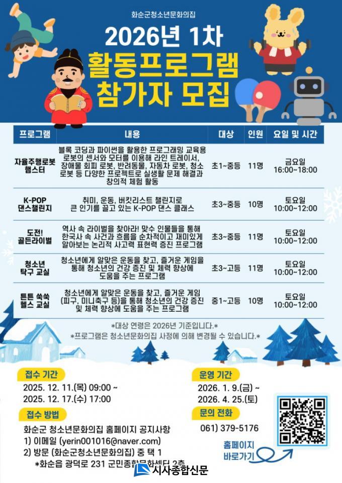 û¼Ò³â¹®ÈÀÇÁýÀº ½Ã¼³À» ÀÌ¿ëÇϴ û¼Ò³â°ú ¿î¿µÀ§¿øÈ¸ÀÇ ÀǰßÀ» ¹Ý¿µÇØ ¡ãÀÚÀ²ÁÖÇà·Îº¿ ÇܽºÅÍ ¡ãK-POP ´í½º 縰Áö ¡ãµµÀü! °ñµç ¶óÀ̹ú ¡ãû¼Ò³â ʱ¸ ±³½Ç ¡ãưư ¾¦¾¦ Çコ ±³½Ç 5°³ ÇÁ·Î±×·¥À» 2026³â 1¿ù 9ÀϺÎÅÍ 4¿ù 25ÀϱîÁö ¸ÅÁÖ ÇØ´ç ¿äÀÏ¿¡ ¿î¿µÇÒ ¿¹Á¤ÀÌ´Ù.