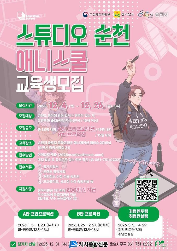 ¡®½ºÆ©µð¿À ¼øÃµ(Studio Suncheon)¡¯Àº ´ëÇѹα¹ ¹®Èµµ½Ã »ç¾÷À¸·Î ÃßÁøÇÏ´Â ÄÜÅÙÃ÷ Àü¹® ¾ÆÄ«µ¥¹Ì·Î, Áö¿ª¿¡ Á¤ÂøÇÑ ÄÜÅÙÃ÷ ±â¾÷°ú Çù·ÂÇØ ¼øÃµ »ê¾÷ÇöÀå¿¡ Æ¯ÈµÈ ½Ç¹« Á᫐ ±³À°°úÁ¤À» Á¦°øÇÑ´Ù. ±³À°Àº À¥Å÷, ¾Ö´Ï¸ÞÀÌ¼Ç 2°¡Áö ºÐ¾ß·Î ±¸¼ºµÇ¸ç, À¥Å÷Àº ±Û·Î¹úÀ¥Å÷Çãºê¼¾ÅÍ¿¡¼, ¾Ö´Ï¸ÞÀ̼ÇÀº ±Û·ÎÄà ¾Ö´Ï¸ÞÀ̼Ç‧¹®ÈÄÜÅÙÃ÷ Ä·ÆÛ½º¿¡¼ 2026³â 1¿ùºÎÅÍ 4¿ù±îÁö ¾à 4°³¿ù°£ ÁøÇàµÈ´Ù.