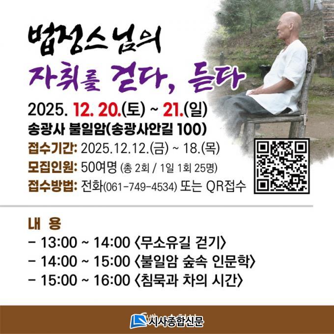 À̹ø ÇÁ·Î±×·¥Àº ¹ýÁ¤½º´ÔÀÇ ¼öÇà ÅÍÀüÀ̾ú´ø ºÒÀϾϿ¡¼ ÁøÇàµÇ´Â ½Ã¹Î Âü¿©Çü Àι® ÇÁ·Î±×·¥À¸·Î, ÃÑ 2ȸ(ȸ´ç 25¸í) ¿î¿µÇϸç ÃÑ 50¿© ¸íÀÌ Âü¿©ÇÒ ¼ö ÀÖ´Ù. Á¢¼ö´Â ¿À´Â 18ÀϱîÁö ÀüÈ(061-749-4534) ¶Ç´Â QRÄÚµå·Î ½Åû °¡´ÉÇÏ´Ù.