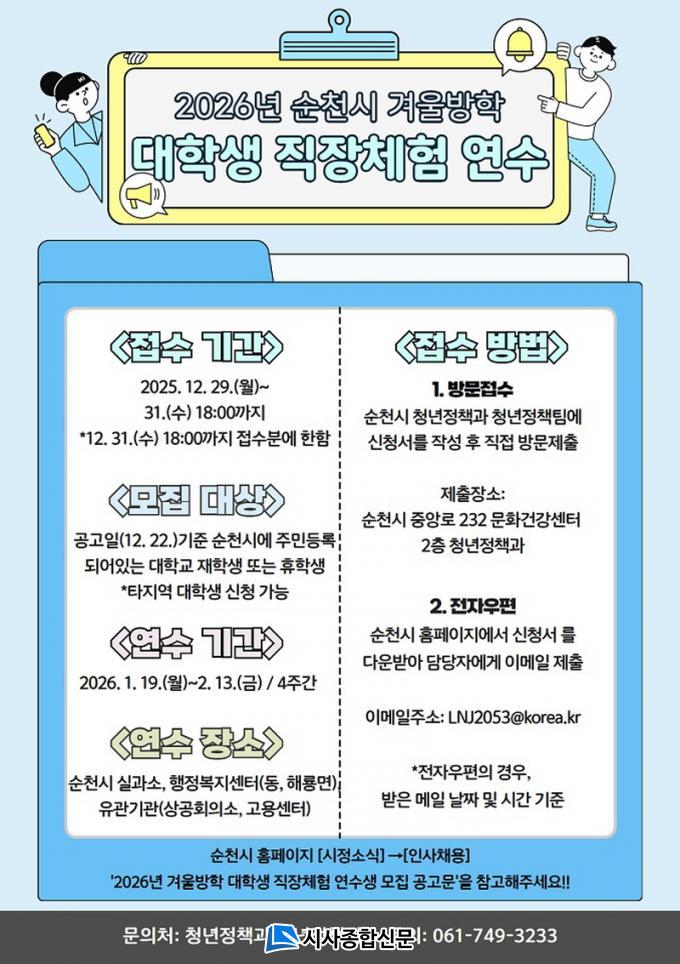 ¼±¹ßµÈ ¿¬¼ö»ýÀº 2026³â 1¿ù 19ÀϺÎÅÍ 2¿ù 13ÀϱîÁö 4ÁÖ°£ ¼øÃµ½Ãû ¹× ÇàÁ¤º¹Áö¼¾ÅÍ¿Í À¯°ü±â°ü¿¡ ¹èÄ¡µÇ¾î ÇÏ·ç 5½Ã°£¾¿ ±Ù¹«Çϸç, ÇàÁ¤¾÷¹«¸¦ º¸Á¶ÇÏ°í °ø°øºÎ¹® ¾÷¹« Àü¹ÝÀ» Á÷Á¢ üÇèÇÏ°Ô µÈ´Ù.