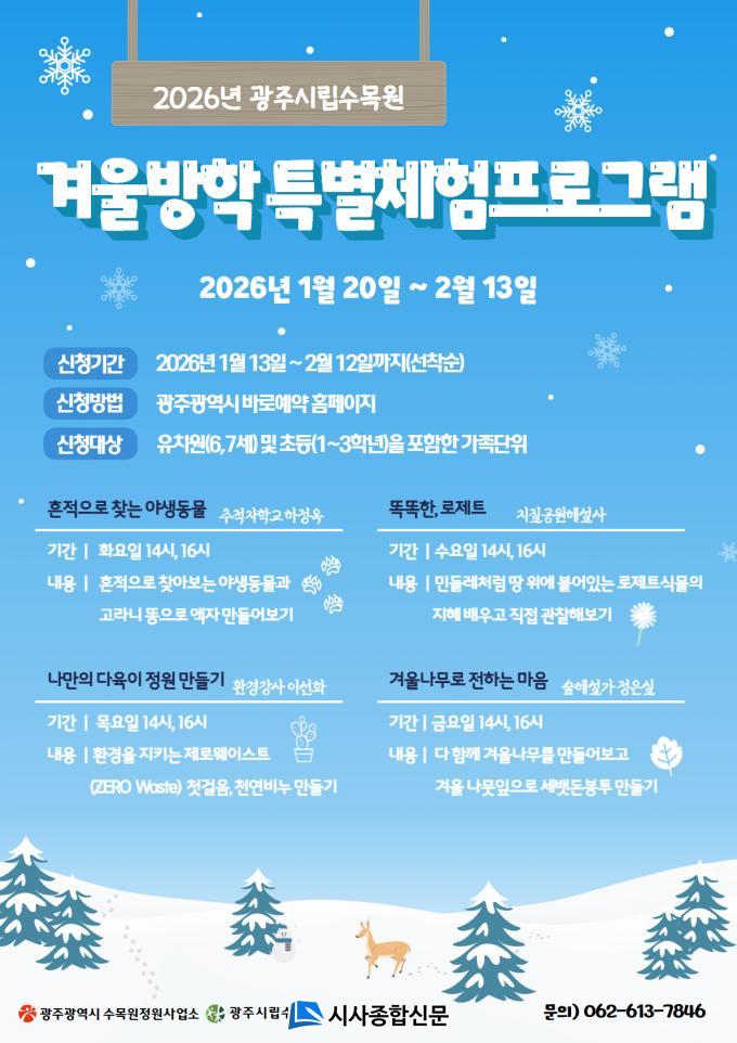üÇè ÇÁ·Î±×·¥Àº ÃÑ 4°¡ÁöÀ̸ç, 6¡10¼¼ Àڳฦ µÐ °¡Á·À» ´ë»óÀ¸·Î 1¿ù20ÀϺÎÅÍ 2¿ù13ÀϱîÁö ÁøÇàÇÑ´Ù. °¢ ÇÁ·Î±×·¥Àº Âü¿© ¾î¸°À̵éÀÌ °Ü¿ï¹æÇÐ µ¿¾È ÀÚ¿¬ °üÂû¡¤»ýÅ ÇнÀ¡¤¸¸µé±â µîÀ» °¡Á·°ú ÇÔ²²Çϸç ÀÚ¿¬°úÀÇ Ä£¹Ð°¨À» ³ôÀÏ ¼ö ÀÖµµ·Ï ±âȹÇß´Ù.
