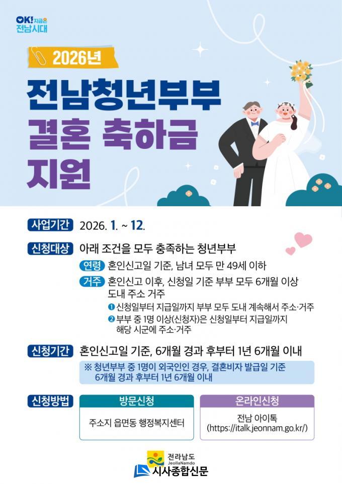 û³âºÎºÎ °áÈ¥ÃàÇÏ±Ý Áö¿ø»ç¾÷Àº Àü³²µµ°¡ 2021³â Àü±¹ ±¤¿ª½Ã¡¤µµ ÃÖÃÊ·Î ½ÃÇàÇß´Ù. Áö¿ø ´ë»óÀº È¥ÀνŰíÀÏ ÇöÀç 49¼¼ ÀÌÇÏ ºÎºÎ´Ù. ½ÅûÀÏ Á÷Àü±îÁö Àü³²¿¡ 6°³¿ù ÀÌ»ó ÁÖ¼Ò¸¦ µÖ¾ß ÇÑ´Ù. È¥ÀνŰí ÈÄ 6°³¿ùÀÌ Áö³ ³¯ºÎÅÍ 1³â 6°³¿ù À̳» ½Åû °¡´ÉÇϸç, ½ÅûÇÑ ´ÞÀÇ ´ÙÀ½ ´Þ 15ÀÏ¿¡ ¹ÞÀ» ¼ö ÀÖ´Ù.