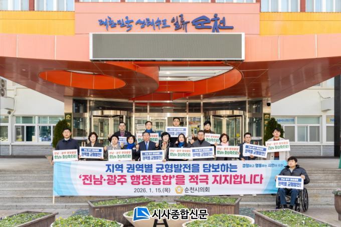 ¼øÃµ½ÃÀÇȸ(ÀÇÀå °Çü±¸) ÀÇ¿ø 18¸íÀº Áö¿ª 3´ë ±Ç¿ª(Àü³²µ¿ºÎ±Ç, Àü³²¼ºÎ±Ç, ±¤ÁÖ±Ç) ±ÕÇü¹ßÀüÀ» Á¶°ÇÀ¸·ÎÇÑ Àü³²¡¤±¤ÁÖ ÇàÁ¤ ÅëÇÕÀ» ÁöÁöÇÏ´Â ¼º¸í¼¸¦ 15ÀÏ ¹ßÇ¥Çß´Ù.