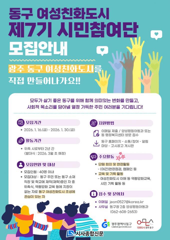 Á¦7±â ½Ã¹ÎÂü¿©´ÜÀº µ¿±¸¿¡ ÁÖ¼Ò¸¦ µÎ°í Àְųª µ¿±¸ ¼ÒÀç Á÷À塤Çб³¿¡ ´Ù´Ï´Â »ç¶÷À» ´ë»óÀ¸·Î °ø°³ ¸ðÁýÇϸç, 40¸í À̳»·Î ±¸¼ºµÉ ¿¹Á¤ÀÌ´Ù. À§ÃË ±â°£Àº ¿ÃÇØ 3¿ùºÎÅÍ ¿À´Â 2028³â 2¿ù±îÁö 2³â°£ÀÌ´Ù.