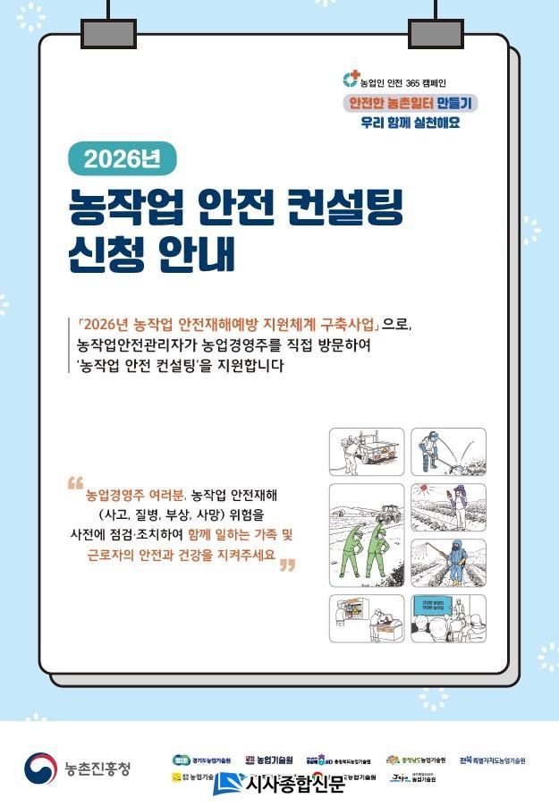À̹ø »ç¾÷Àº ³ó¾÷ ºÐ¾ß Áß´ëÀçÇØ ¿¹¹æ°ú ¾ÈÀüÇÑ ³óÀÛ¾÷ ȯ°æ Á¶¼ºÀ» À§ÇØ ¸¶·ÃµÆ´Ù. ³óÀÛ¾÷ ¾ÈÀü°ü¸®ÀÚ°¡ ³ó¾÷°æ¿µÁÖ¸¦ Á÷Á¢ ¹æ¹®ÇØ ³óÀÛ¾÷ ÇöÀåÀÇ À§Çè ¿äÀÎÀ» Áø´ÜÇÏ°í ³ó°¡ ¿©°Ç¿¡ ¸Â´Â ¸ÂÃãÇü ¾ÈÀü°ü¸® ÄÁ¼³ÆÃÀ» Á¦°øÇÑ´Ù.