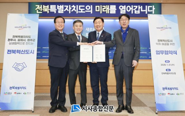 µµ´Â 21ÀÏ µµÃ» 4Ãþ ȸÀǽǿ¡¼ ±è°ü¿µ ÀüºÏÀÚÄ¡µµÁö»ç¿Í ¿ì¹ü±â ÀüÁÖ½ÃÀå, Á¤¼ºÁÖ ±èÁ¦½ÃÀå, À¯ÈñÅ ¿ÏÁÖ±º¼ö°¡ Âü¼®ÇÑ °¡¿îµ¥ Çõ½Åµµ½Ã ¾ÇÃë ÇØ°áÀ» À§ÇÑ ¾÷¹«Çù¾àÀ» ü°áÇß´Ù. À̹ø Çù¾àÀº »ç¾÷ ´ë»óÁö¿ªÀÎ ±èÁ¦½Ã¿Í Çõ½Åµµ½Ã°¡ À§Ä¡ÇÑ ÀüÁÖ½Ã, ¿ÏÁÖ±ºÀÌ ÇÔ²² Àç¿øÀ» ºÎ´ãÇÏ´Â ¹æ½ÄÀ¸·Î, Áö¿ª ȯ°æ Çö¾È¿¡ °øµ¿ ´ëÀÀÇÑ´Ù´Â Á¡¿¡¼ Àǹ̰¡ Å©´Ù.