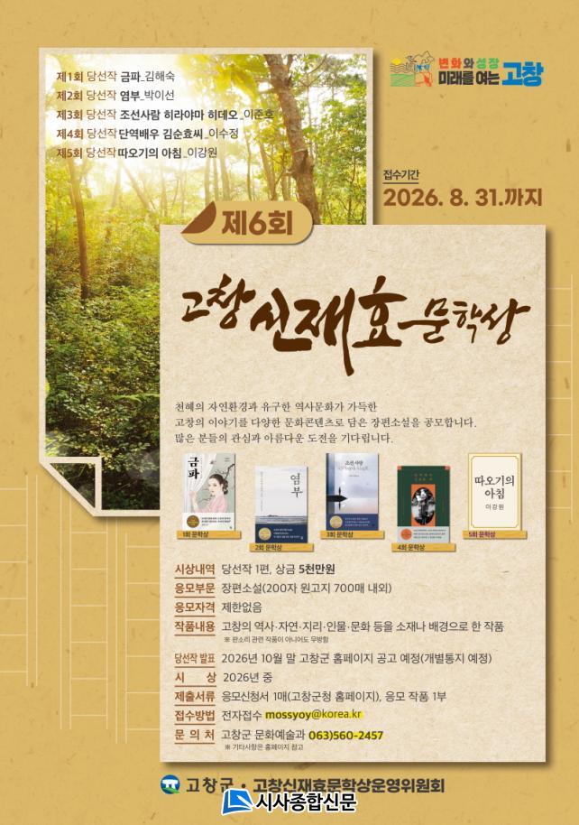 ÇÑÆí, Á¦6ȸ °íâ½ÅÀçÈ¿¹®ÇÐ»ó °ø¸ðÀüÀº 8¿ù 31ÀϱîÁö À̸ÞÀÏ·Î Á¢¼ö ¹ÞÀ¸¸ç, ´ç¼±ÀÛÀº 10¿ù Áß ¹ßÇ¥µÉ ¿¹Á¤ÀÌ´Ù.
