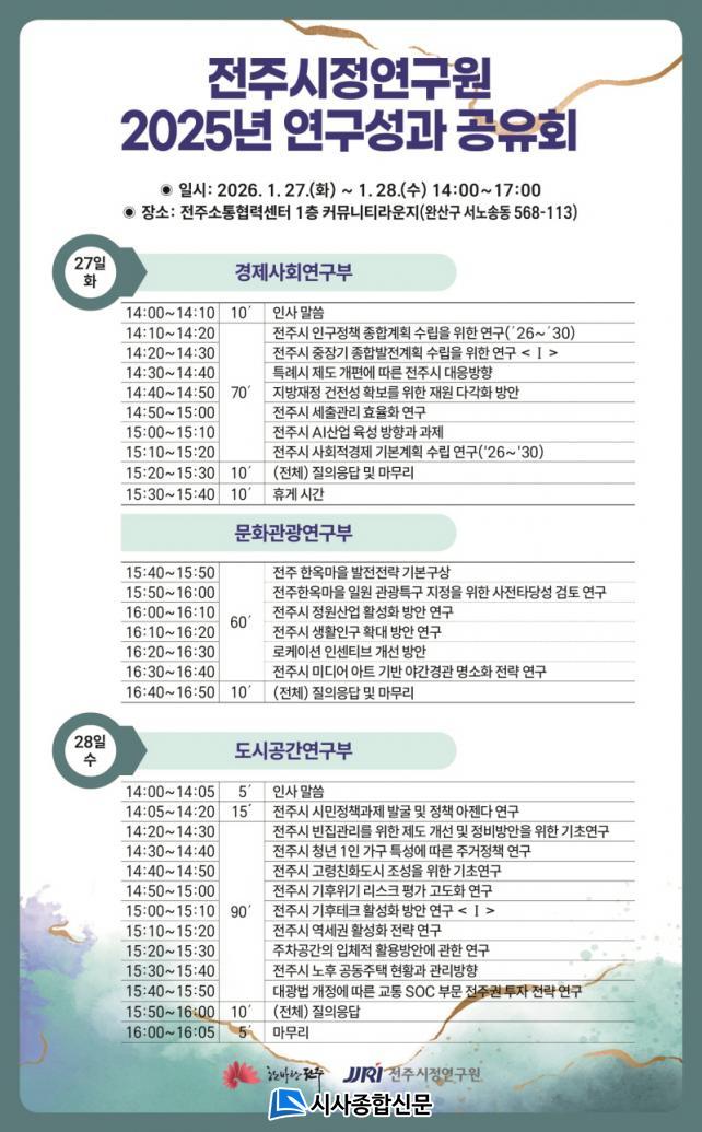À̹ø ¿¬±¸¼º°ú °øÀ¯È¸´Â °ü½ÉÀÖ´Â ½Ã¹Î ´©±¸³ª Âü¼® °¡´ÉÇϸç, ¹ßÇ¥ Á¾·á ÈÄ¿¡´Â Á¾ÇÕ ÁúÀÇÀÀ´ä ½Ã°£À» ÅëÇØ ´Ù¾çÇÑ ÀǰßÀ» ³ª´ ¿¹Á¤ÀÌ´Ù. ¿¬±¸¼º°ú °øÀ¯È¸¿Í °ü·ÃÇÑ ÀÚ¼¼ÇÑ »çÇ×Àº ½ÃÁ¤¿¬±¸¿ø(063-288-9357, 9352, 8420)À¸·Î ¹®ÀÇÇÏ¸é µÈ´Ù.