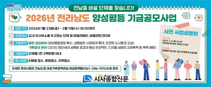 Âü¿©¸¦ ¹Ù¶ó´Â ´Üü´Â 11ÀϱîÁö Àü³²µµ ¿©¼º°¡Á·Á¤Ã¥°ü½Ç·Î ½Åû¼·ù¸¦ µî±â¿ìÆí, ¹æ¹® ¶Ç´Â ÀüÀÚ¿ìÆíÀ¸·Î Á¦ÃâÇÏ¸é µÈ´Ù. ¼¼ºÎ °ø¸ð ³»¿ë°ú ½Åû ¼½ÄÀº Àü³²µµ¿Í ½Ã±º ´©¸®Áý¿¡¼ È®ÀÎÇÒ ¼ö ÀÖ´Ù.