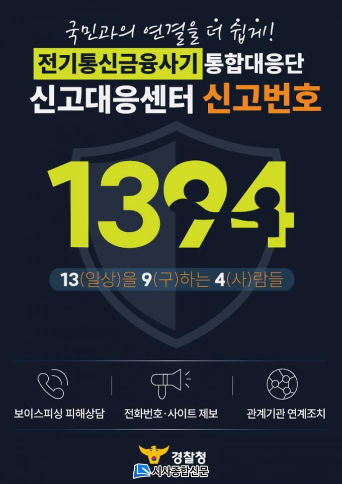 ÇÑÆí, °æÂûûÀº º¸À̽ºÇÇ½Ì ¿¹¹æ°ú ½Å¼ÓÇÑ ÇÇÇØ ´ëÀÀÀ» À§ÇØ Àü±âÅë½Å±ÝÀ¶»ç±â½Å°í´ëÀÀ¼¾Å͸¦ ¿î¿µÇϰí ÀÖ´Ù. 2¿ù 1ÀϺÎÅÍ´Â ±¹¹Î Á¢±Ù¼ºÀ» ³ôÀ̱â À§ÇØ ¼¾ÅÍ ´ëÇ¥¹øÈ£·Î ¡®1394*¡¯¸¦ »ç¿ëÇϸç, º¸À̽ºÇǽÌÀÌ ÀÇ½ÉµÉ °æ¿ì Áï½Ã 112 ¶Ç´Â 1394·Î ½Å°íÇÏ¸é µÈ´Ù.