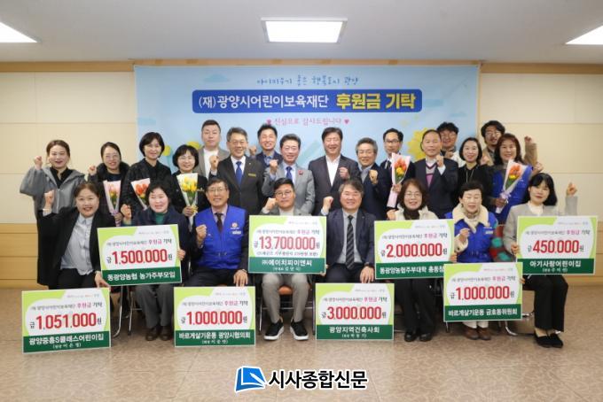 À̹ø ±âŹ½Ä¿¡¼´Â Áö¿ª ±â¾÷°ú ´Üü, º¸À°ÇöÀåÀÌ ÇÔ²² ¶æÀ» ¸ð¾Æ ÃÑ 2,370¸¸ ¿ø »ó´çÀÇ ÈÄ¿ø±ÝÀ» Àü´ÞÇßÀ¸¸ç, Âü¿© ±â°üº° ±âŹ ±Ý¾×Àº ¡ã(ÁÖ)¿¡ÀÌÄ¡ÇÇÀ̾ؾ¾(ºÎ´ëÇ¥ ±è¸¸½Ä) 1,370¸¸ ¿ø ¡ã±¤¾çÁö¿ª°ÇÃà»çȸ(ȸÀå ¹Úµ¿±â) 300¸¸ ¿ø ¡ãµ¿±¤¾ç³óÇù ÁֺδëÇÐ Ãѵ¿Ã¢È¸(ȸÀå ÀÌÁ¤¼ø) 200¸¸ ¿ø ¡ãµ¿±¤¾ç³óÇù ³ó°¡ÁֺθðÀÓ(ȸÀå ¹Ú¸Í¿±) 150¸¸ ¿ø ¡ã¹Ù¸£°Ô»ì±â¿îµ¿ ±¤¾ç½ÃÇùÀÇȸ(ȸÀå À̽¾È) 100¸¸ ¿ø ¡ã¹Ù¸£°Ô»ì±â¿îµ¿ ±ÝÈ£µ¿À§¿øÈ¸(Àü À§¿øÀå ½É¼ø¾Ö) 100¸¸ ¿ø ¡ã±¤¾çÁßÈï SŬ·¡½º¾î¸°ÀÌÁý(¿øÀå ÀÌÀºÁ¤) 105¸¸1,000¿ø ¡ã¾Æ±â»ç¶û¾î¸°ÀÌÁý(¿øÀå Áֹ̼±) 45¸¸ ¿ø, ÃÑ 2,370¸¸ ¿ø »ó´çÀÌ´Ù.