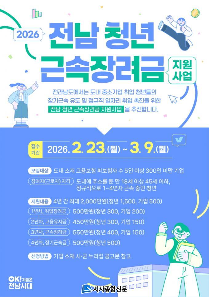 Áö¿ø±ÝÀº ÃÖÀå 4³â°£ ±Ù¼Ó ¿¬Â÷¿¡ µû¶ó Â÷µî Áö±ÞÇϸç, ±â¾÷¿¡´Â ÃÖ´ë 500¸¸ ¿ø, û³â ±Ù·ÎÀÚ¿¡°Ô ÃÖ´ë 1õ500¸¸ ¿øÀ» Áö¿øÇÑ´Ù. ¿ÃÇØ´Â 400°³ ±â¾÷, 1õ ¸í û³â ±Ù·ÎÀÚ¸¦ ´ë»óÀ¸·Î ÃßÁøÇÑ´Ù. Âü¿©¸¦ ¿øÇÏ´Â ±â¾÷Àº ¼ÒÀçÁö ½Ã±º ´©¸®Áý °ø°í¹®À» È®ÀÎÇØ ½ÅûÇÏ¸é µÈ´Ù.