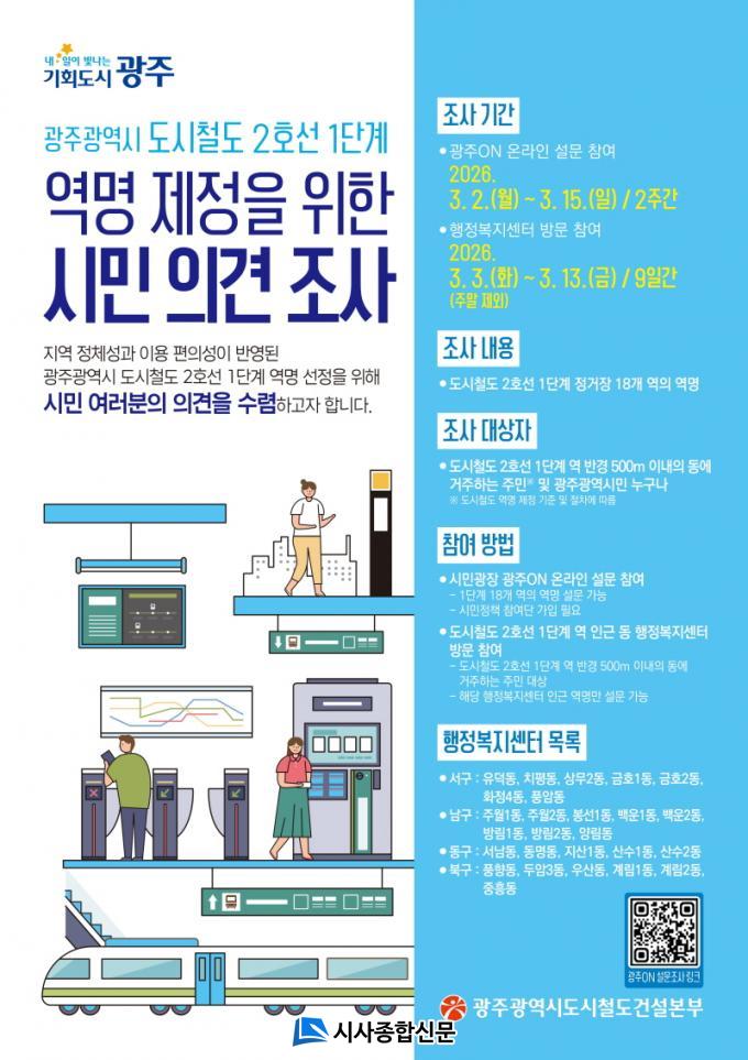 À̹ø Á¶»ç´Â ¡®µµ½Ãöµµ ¿ª¸í Á¦Á¤ ±âÁØ ¹× ÀýÂ÷ ÃßÁø °èȹ¡¯¿¡ µû¶ó ÁøÇàµÈ´Ù. ±¤ÁֽùΠ´©±¸³ª ¿Â¶óÀÎ ½Ã¹ÎÂü¿© Ç÷§Æû ¡®±¤ÁÖ¿Â(ON)¡¯À» ÅëÇØ Âü¿©ÇÒ ¼ö ÀÖÀ¸¸ç, °¢ ¿ª»ç ¹Ý°æ 500m À̳» ÁÖ¹ÎÀº ÇàÁ¤º¹Áö¼¾ÅÍ¿¡ ºñÄ¡µÈ ¼³¹®Áö¸¦ ÅëÇØ °ÅÁÖÁö Àα٠Á¤°ÅÀå ¿ª¸í¿¡ ´ëÇÑ ÀǰßÀ» ¿ÀÇÁ¶óÀÎÀ¸·Îµµ Á¦ÃâÇÒ ¼ö ÀÖ´Ù.