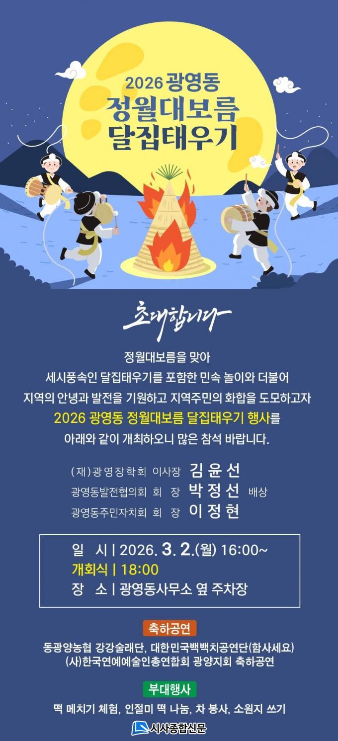 ¹ÚÁ¤¼± ±¤¿µµ¿¹ßÀüÇùÀÇȸ ȸÀåÀº ¡°Á¤¿ù´ëº¸¸§ ´ÞÁýÅ¿ì±â¸¦ ÅëÇØ ÁֹεéÀÌ ¼·Î ÈÇÕÇÏ°í ¼ÒÅëÇÏ´Â ½Ã°£ÀÌ µÇ±æ ¹Ù¶õ´Ù¡±¸ç ¡°2026³â º´¿À³â(ܰçíÒ´) ÇÑ ÇØ µ¿¾È ¸ðµÎÀÇ ¼Ò¸ÁÀÌ ÀÌ·ç¾îÁö±æ ±â¿øÇÑ´Ù¡±°í ÀüÇß´Ù.