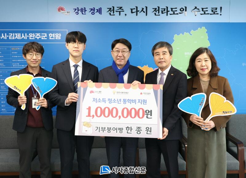 ÀüÁֽú¹ÁöÀç´Ü(ÀÌ»çÀå À±¹æ¼®)Àº 3ÀÏ ÀüÁֽà ÅÂÆòµ¿¿¡ °ÅÁÖÇÏ´Â ÇÑÁ¾¿ø ¾¾(22¼¼)°¡ Àú¼Òµæ°¡Á¤ û¼Ò³â ÅëÇкñ Áö¿øÀ» À§ÇÑ ¼º±Ý 100¸¸ ¿øÀ» Àü´ÞÇß´Ù°í ¹àÇû´Ù.