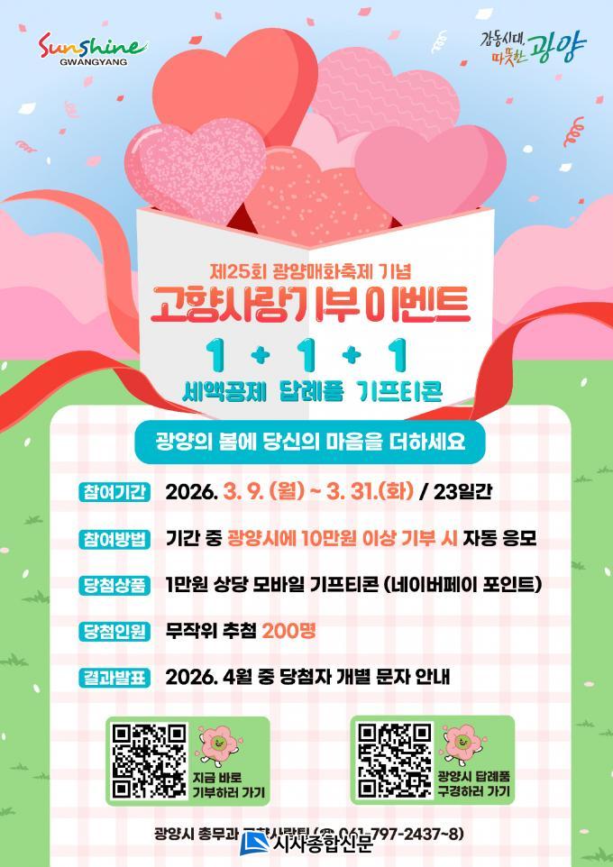 À̹ø À̺¥Æ®´Â '1+1+1' ÇýÅÃÀ» Áß½ÉÀ¸·Î ¸¶·ÃµÆ´Ù. °íÇâ»ç¶û±âºÎÁ¦¸¦ ÅëÇØ ±¤¾ç½Ã¿¡ 10¸¸ ¿øÀ» ±âºÎÇϸé Àü¾× ¼¼¾×°øÁ¦¸¦ ¹ÞÀ» ¼ö ÀÖÀ¸¸ç, ±âºÎ¾×ÀÇ 30% À̳»¿¡¼ °ù°¨, Àçø±¹, ±âÁ¤¶± µî ±¤¾ç½Ã Áö¿ª Ư»êǰÀ» ´ä·ÊǰÀ¸·Î ¹ÞÀ» ¼ö ÀÖ´Ù. ¿©±â¿¡ ¸ð¹ÙÀÏ ±âÇÁƼÄÜ ÇýÅñîÁö ´õÇØÁ® ±âºÎ Âü¿©ÀÇ ¸¸Á·µµ¸¦ ³ôÀÏ °ÍÀ¸·Î ±â´ëµÈ´Ù.