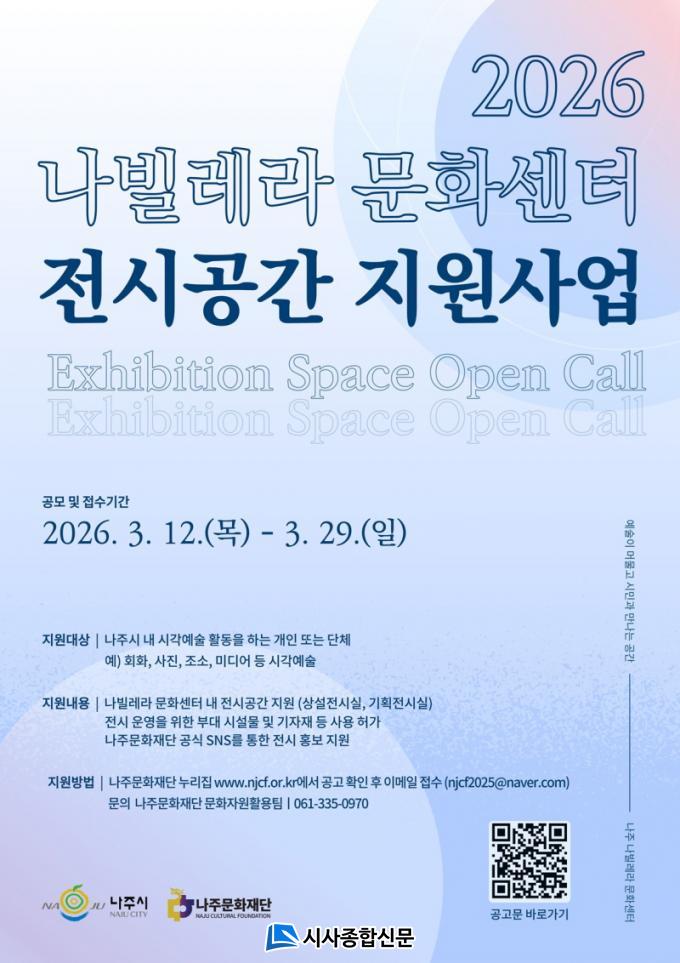 ³ªÁÖ¹®ÈÀç´ÜÀº ¿À´Â 3¿ù 29ÀϱîÁö Áö¿ª ½Ã°¢¿¹¼ú ÀÛ°¡¿Í ´Üü¸¦ ´ë»óÀ¸·Î ³ªºô·¹¶ó¹®È¼¾ÅÍ ³» Àü½Ã°ø°£À» ¹«»óÀ¸·Î Áö¿øÇÏ´Â °ø¸ð»ç¾÷À» ÁøÇàÇÑ´Ù°í 13ÀÏ ¹àÇû´Ù.