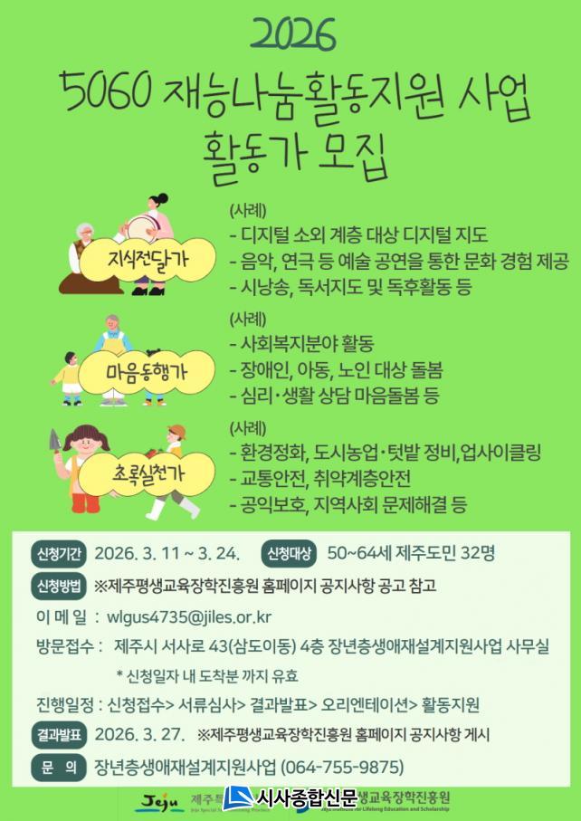 | (Àç)Á¦ÁÖÆò»ý±³À°ÀåÇÐÁøÈï¿ø, 5060Àç´É³ª´® Ȱµ¿°¡ ¸ðÁý Á¦ÁÖµµ¹Î ¸¸ 50¼¼ ~ 64¼¼ ´ë»ó, 3¿ù 24ÀÏ(È)±îÁö ½Åû Á¢¼ö |