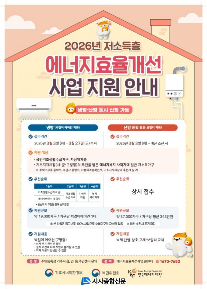 ³Ã¹æ Áö¿ø ºÐ¾ß´Â ¿À´Â 3¿ù 27ÀϱîÁö ½ÅûÀ» ¹Þ´Â´Ù. ¿¡¾îÄÁÀÌ ¾ø°Å³ª ³ëÈÄÈµÈ °¡±¸¸¦ ´ë»óÀ¸·Î º®°ÉÀÌÇü ¿¡¾îÄÁ 1´ë¸¦ ¼³Ä¡ÇØ Æø¿°¿¡ Ãë¾àÇÑ °¡±¸ÀÇ ¿©¸§Ã¶ ³Ã¹æ ȯ°æ °³¼±À» µµ¿ï °èȹÀÌ´Ù.