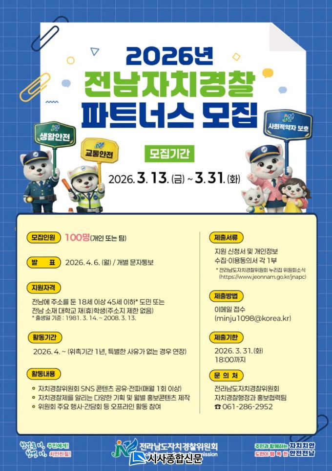 Àü³²ÀÚÄ¡°æÂû ÆÄÆ®³Ê½º´Â SNS ÄÜÅÙÃ÷ Á¦ÀÛ°ú È«º¸ Ȱµ¿À» ÅëÇØ ÀÚÄ¡°æÂû Á¦µµ¿Í Á¤Ã¥À» µµ¹Î¿¡°Ô ¾Ë¸®´Â È«º¸´ÜÀ¸·Î, °³ÀÎÀ̳ª ÆÀ ´ÜÀ§·Î ÃÑ 100¸íÀ» ¼±¹ßÇÒ ¿¹Á¤ÀÌ´Ù.