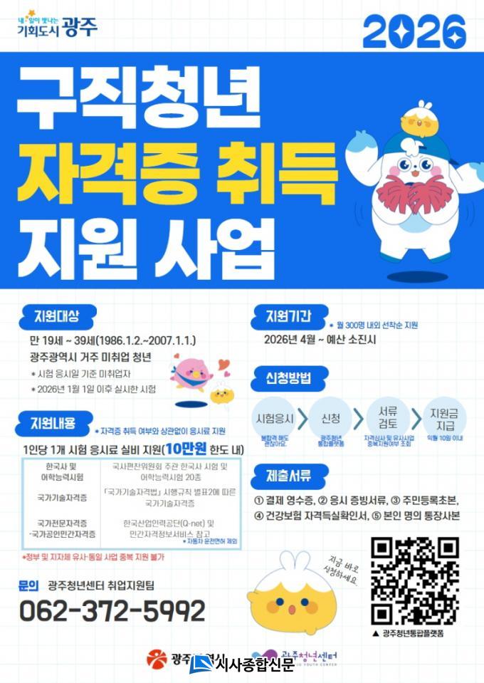 Áö¿ø ´ë»óÀº ±¤Áֽÿ¡ °ÅÁÖÇÏ´Â 19¼¼ºÎÅÍ 39¼¼ ÀÌÇÏ ¹ÌÃë¾÷ û³âÀÌ´Ù. Çѱ¹»ç¿Í ¾îÇнÃÇè 20Á¾À» Æ÷ÇÔÇØ ±¹°¡±â¼úÀÚ°ÝÁõ, ±¹°¡Àü¹®ÀÚ°ÝÁõ(¿îÀü¸éÇã Á¦¿Ü), ±¹°¡°øÀιΰ£ÀÚ°ÝÁõ ½ÃÇè ÀÀ½Ã·á¸¦ 1ÀÎ´ç ¿¬ 1ȸ, ÃÖ´ë 10¸¸¿ø±îÁö Áö¿øÇÑ´Ù.