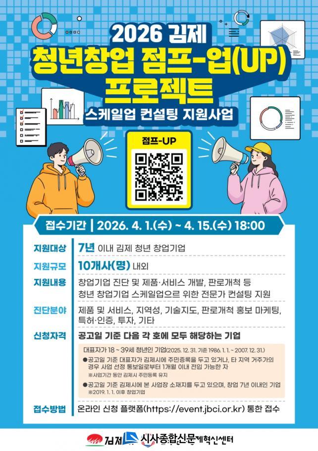 Áö¿ø ´ë»óÀº â¾÷ 7³â À̳»ÀÇ ±èÁ¦½Ã ¼ÒÀç û³â â¾÷±â¾÷ 10°³ »çÀ̸ç, Âü¿© ½ÅûÀº 2026³â 4¿ù 1ÀϺÎÅÍ 15ÀϱîÁö ÀüºÏâÁ¶°æÁ¦Çõ½Å¼¾ÅÍ ¿Â¶óÀÎ ½Åû Ç÷§Æû(https://event.jbci.or.kr)¿¡¼ °¡´ÉÇÏ´Ù. »ó¼¼ÇÑ ½É»ç ¹× ¼±Á¤ ÀýÂ÷´Â ȨÆäÀÌÁö °øÁö¿¡¼ È®ÀÎÇÒ ¼ö ÀÖ´Ù.