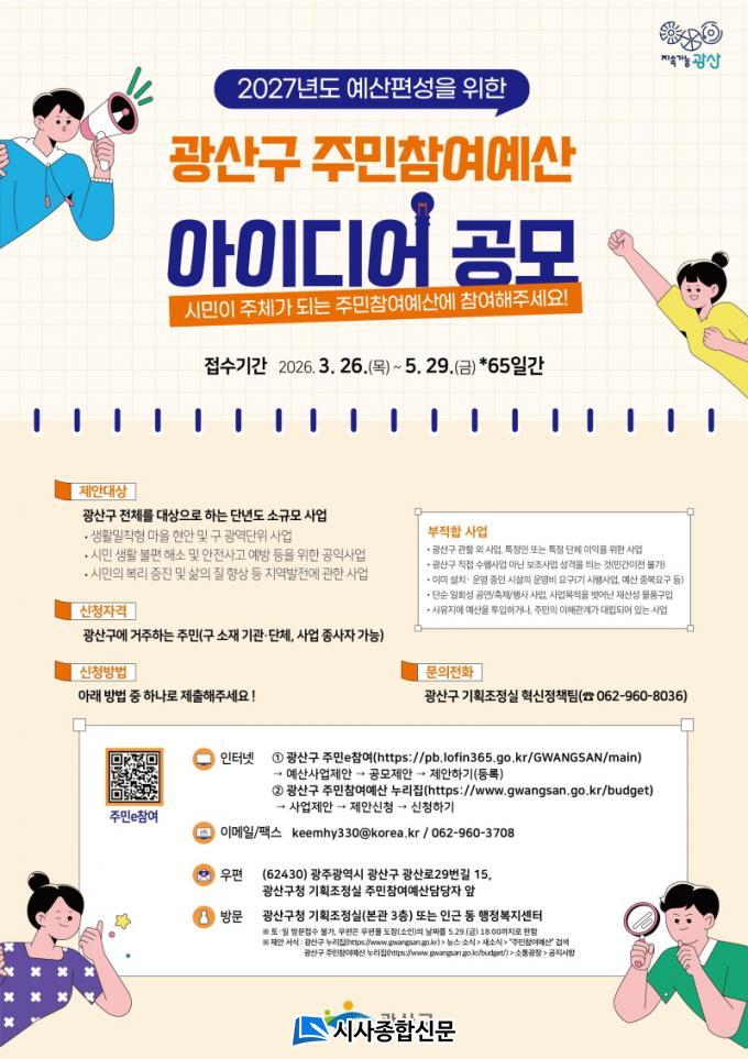 ±¤»ê±¸´Â Á¢¼öµÈ Á¦¾È¿¡ ´ëÇØ °ü·Ã ºÎ¼ÀÇ »ç¾÷ Ÿ´ç¼º °ËÅä, ÁÖ¹ÎÂü¿©¿¹»êÀ§¿øÈ¸ÀÇ ½É»ç¸¦ °ÅÃÄ 10¿ù Áß ³»³â ¿¹»ê¾È¿¡ ¹Ý¿µÇÒ »ç¾÷À» ¼±Á¤ÇÒ °èȹÀÌ´Ù. ¼±Á¤µÈ ÁÖ¹ÎÂü¿©¿¹»ê »ç¾÷Àº ±¤»ê±¸ÀÇȸ ¿¹»ê ½ÉÀǸ¦ ÅëÇØ 2027³âµµ º»¿¹»ê Æí¼º ¿©ºÎ°¡ °áÁ¤µÈ´Ù.