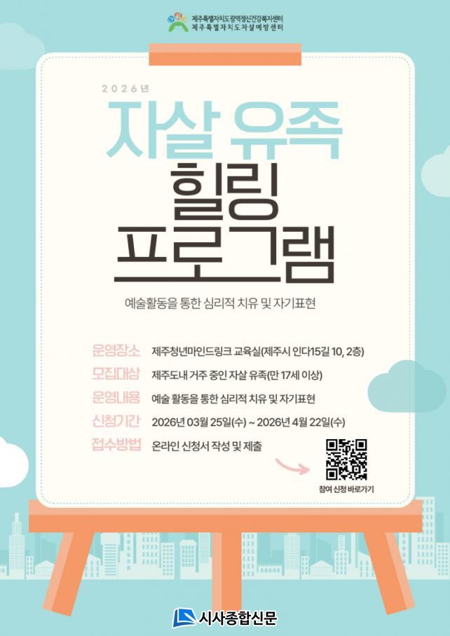 À̹ø ÇÁ·Î±×·¥Àº 4¿ù 26ÀÏ(ÀÏ)ºÎÅÍ 5¿ù 24ÀÏ(ÀÏ)±îÁö Á¦ÁÖû³â¸¶Àε帵ũ ±³À°½Ç¿¡¼ ¸ÅÁÖ 1ȸ, ÃÑ 5ȸ±â·Î ÁøÇàµÈ´Ù. ¿¹¼ú Ȱµ¿ Áß½ÉÀ¸·Î ¿î¿µµÇ¸ç, Âü¿©ÀÚµéÀÌ ¸»·Î Ç¥ÇöÇϱ⠾î·Á¿î »ó½ÇÀÇ °¨Á¤À» ÀÚ¿¬½º·´°Ô Ç¥ÇöÇϰí, ÀÚ±â ÀÌÇØ¸¦ ÅëÇØ ½É¸®Àû ¾ÈÁ¤À» ãÀ» ¼ö ÀÖµµ·Ï µ½´Â °ÍÀ» ¸ñÇ¥·Î ÇÑ´Ù.