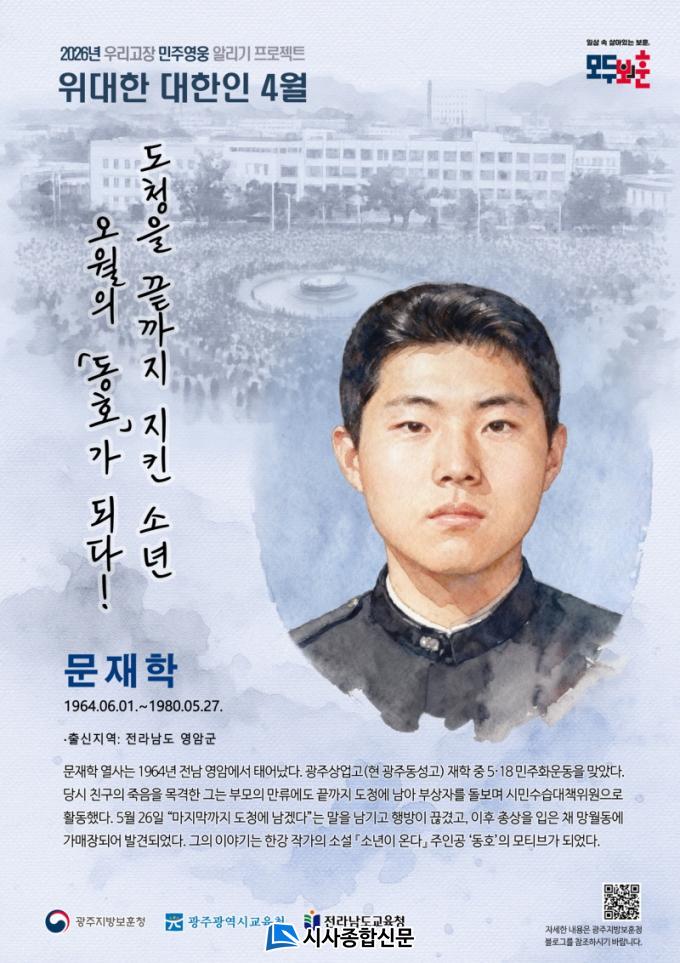 [½Ã»çÁ¾ÇսŹ® = ¿À½ÂÅà ±âÀÚ] ±¤ÁÖÁö¹æº¸ÈÆÃ»Àº 2026³â 4¿ù ¡®¿ì¸®°íÀå À§´ëÇÑ ´ëÇÑÀΡ¯À¸·Î 5¡¤18¹ÎÁÖÈ­¿îµ¿ ´ç½Ã Àü³²µµÃ»À» ³¡±îÁö ÁöŰ´Ù Èñ»ýµÈ ¼Ò³â, ¹®ÀçÇÐ ¿­»ç¸¦ ¼±Á¤Çß´Ù.