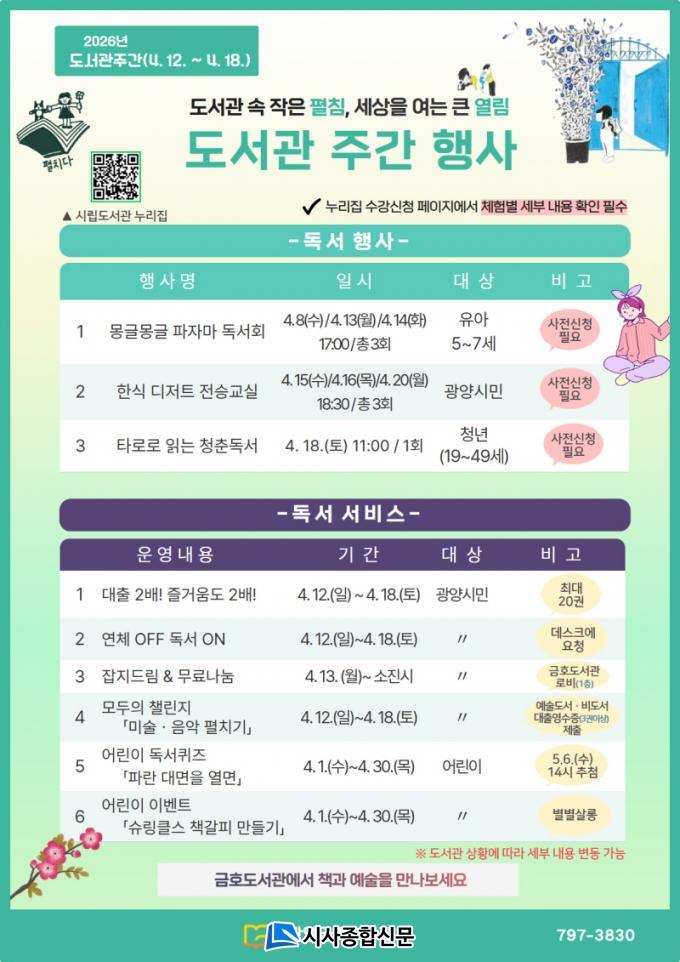 ±¤¾ç±ÝÈ£µµ¼°üÀº 4¿ù 12ÀϺÎÅÍ 18ÀϱîÁö µµ¼°üÁÖ°£ ±â°£ µ¿¾È ¡ãÀâÁöµå¸²&¹«·á³ª´® ¡ã¸ðµÎÀÇ Ã§¸°Áö(¿¹¼úÃ¥ ÆîÄ¡±â) ¡ã½´¸µÅ¬½º Ã¥°¥ÇÇ ¸¸µé±â µî ´Ù¾çÇÑ µ¶¼¡¤¹®È À̺¥Æ®µµ ÇÔ²² ¿î¿µÇÒ ¿¹Á¤ÀÌ´Ù.