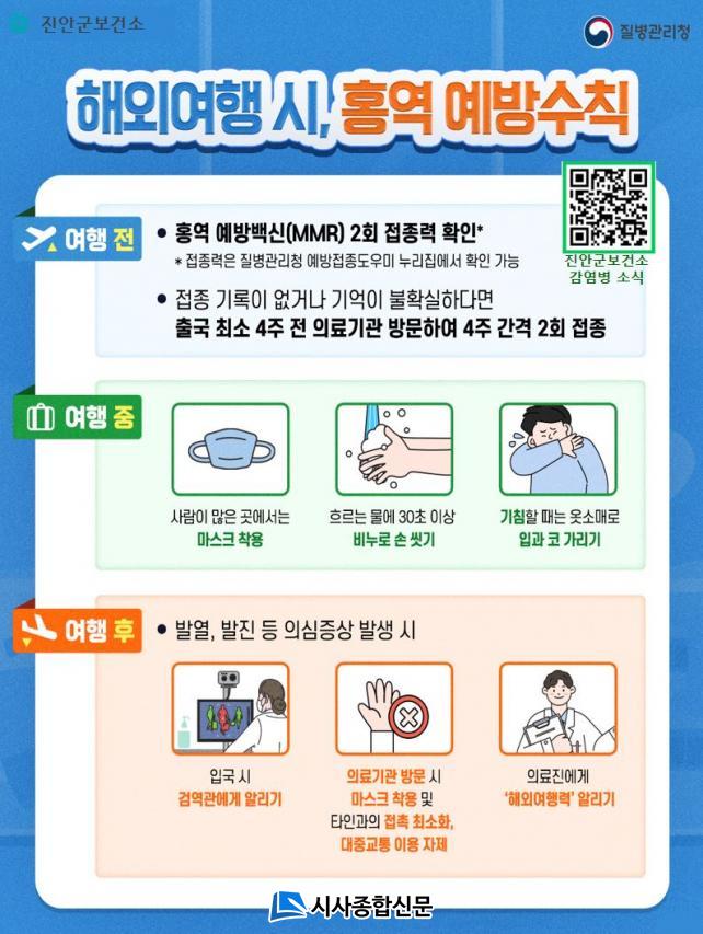 ¶ÇÇÑ ÇØ¿Ü ü·ù Áß¿¡´Â »ç¶÷ÀÌ ¸¹ÀÌ ¸ðÀÌ´Â Àå¼Ò¿¡¼ ¸¶½ºÅ© Âø¿ë, ¼Õ ¾Ä±â, ±âħ¿¹Àý Áؼö µî °³ÀÎÀ§»ý ¼öÄ¢À» öÀúÈ÷ ÁöÄÑ¾ß Çϸç, ±Í±¹ ÈÄ 3ÁÖ À̳» ¹ß¿À̳ª ¹ßÁø Áõ»óÀÌ ³ªÅ¸³¯ °æ¿ì Áï½Ã ÀÇ·á±â°üÀ» ¹æ¹®Çϰí ÇØ¿Ü¿©Çà·ÂÀ» ¹Ýµå½Ã ¾Ë·Á¾ß ÇÑ´Ù.