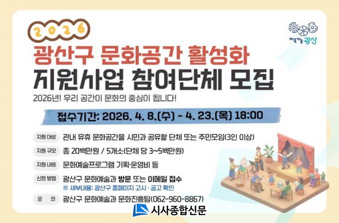 ±¤»ê±¸´Â 23ÀϱîÁö »ç¾÷¿¡ µ¿ÂüÇÒ ´Üü¸¦ ¸ðÁýÇÑ´Ù. ±¤»ê±¸¿¡ ¹®È°ø°£À» º¸À¯(¿î¿µ)Çϰí Àְųª »ç¿ë Çã°¡ µîÀ» ¹Þ¾Æ Áö¿ª»çȸ¿Í °ø°£À» °øÀ¯ÇÒ ÀÇÁö°¡ ÀÖ´Â ¹Î°£´Üü, 3ÀÎ ÀÌ»ó ÁֹΠ¸ðÀÓÀÌ ½ÅûÇÒ ¼ö ÀÖ´Ù.
