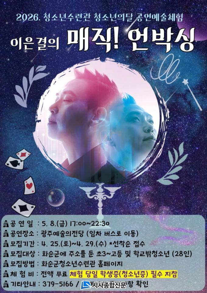 ½Åû ´ë»óÀº ÃʵîÇб³ 3ÇгâºÎÅÍ °íµîÇлý, Çб³ ¹Û û¼Ò³â±îÁöÀ̸ç, Á¢¼ö ±â°£Àº 4¿ù 25ÀϺÎÅÍ 4¿ù 29ÀϱîÁö´Ù. ½ÅûÀº ȼø±ºÃ»¼Ò³â¼ö·Ã°ü ȨÆäÀÌÁö(https://hwasunyouth.kr) ÇÁ·Î±×·¥ ½Åû °Ô½ÃÆÇÀ» ÅëÇØ °¡´ÉÇÏ´Ù.