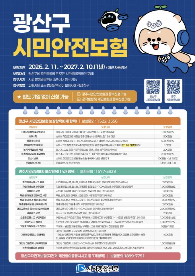 ±¤»ê±¸ ½Ã¹Î¾ÈÀüº¸ÇèÀº µî·Ï ¿Ü±¹ÀÎÀ» Æ÷ÇÔÇØ ±¤»ê±¸¿¡ Áֹεî·ÏÀ» µÐ ¸ðµç ½Ã¹ÎÀÌ º°µµÀÇ °¡ÀÔ ÀýÂ÷ ¾øÀÌ ÀÚµ¿ °¡ÀԵȴÙ. º¸Çè·á´Â Àü¾× ±¤»ê±¸°¡ ºÎ´ãÇÑ´Ù. ½Ç»ýȰ¿¡¼ ´©±¸³ª °ÞÀ» ¼ö ÀÖ´Â ´Ù¾çÇÑ ÇÇÇØ¸¦ º¸ÀåÇϰí, °³Àκ¸Çè°ú Áߺ¹À¸·Î ½Åûµµ °¡´ÉÇÏ´Ù.