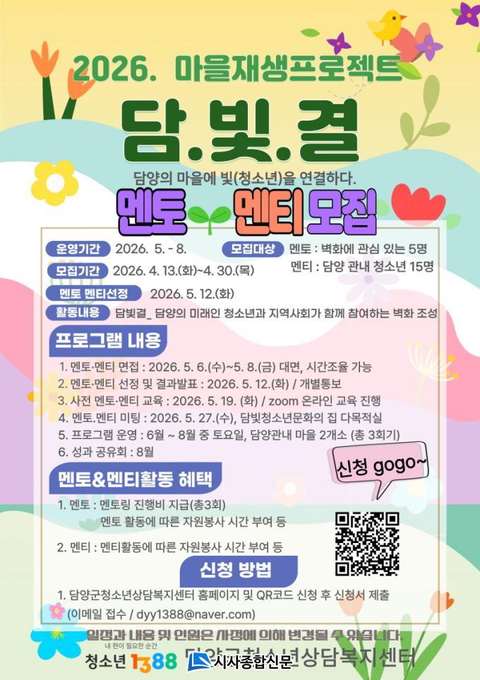¸àƼ 15¸í°ú ¸àÅä 5¸íÀ» ¼±¹ßÇÒ ¿¹Á¤À̸ç, ¸àƼ´Â ´ã¾ç Áö¿ª ³» ¸¸ 9¼¼ºÎÅÍ 18¼¼±îÁö û¼Ò³âÀ» ´ë»óÀ¸·Î ÇÑ´Ù. ¸àÅä´Â ´ã¾ç ¹× Àα٠Áö¿ª¿¡¼ º®È Ȱµ¿ ¹× ¹Ì¼ú¿¡ °ü½É ÀÖ´Â ÁÖ¹ÎÀ̶ó¸é ´©±¸³ª Áö¿ø °¡´ÉÇÏ´Ù.