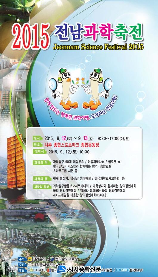 2015 Àü³²°úÇÐÃàÀüÀº Àü³²µµ±³À°Ã»°ú Àü¶ó³²µµ°¡ ÁÖÃÖÇϰí, Àü³²°úÇб³¿ø ¿¬±¸È¸ÀÎ °úÇÐÀ» »ç¶ûÇÏ´Â »ç¶÷µéÀÌ ÁÖ°üÇϸç, Çѱ¹¹Ù½ºÇÁ(BASF), ³ªÁÖ½Ã, Çѱ¹°úÇÐâÀÇÀç´Ü µîÀÌ ÈÄ¿øÇϸç, Àü³²±³À°Ã»Àº À̹ø Çà»ç¿¡ Çлý ¹× Çкθð, Áö¿ª ÁֹΠµî 4¸¸ ¿©¸íÀÌ Âü¿©ÇÒ °ÍÀ¸·Î ¿¹»óÇϰí, 100¿©°³ÀÇ ´Ù¾çÇÑ °úÇРüÇè ÇÁ·Î±×·¥À» ¿î¿µ, ½Å³ª°í Èï¹Ì·Î¿î °úÇÐ ¿ø¸® ޱ¸¿Í üÇèÀÇ ±âȸ¸¦ Á¦°øÇÑ´Ù. ƯÈ÷ ¿ÃÇØ °úÇÐÃàÀü¿¡´Â µ¿¾Æ¸®È°µ¿ ¿î¿µÇб³ µî ´Ù¾çÇÑ ºÎ½º¿î¿µ ´Üü°¡ Âü¿©Çϰí, °¡Á·°ú ÇÔ²²ÇÏ´Â °æ¿¬´ëȸ µîÀÌ Ç³¼ºÇÏ°Ô ¿î¿µµÉ ¿¹Á¤ÀÌ´Ù.