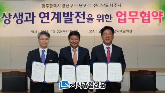 °ÀÎ±Ô ³ªÁÖ½ÃÀå°ú ¹ÎÇü¹è ±¤»ê±¸Ã»Àå, ÃÖÇüÈ£ ³²±¸Ã»ÀåÀº 22ÀÏ Àú³á 6½Ã ±¤ÁÖ±¤¿ª½Ã ³²±¸ ¹®È¿¹¼úȸ°ü¿¡¼ »ó»ý ¿¬°è¹ßÀü Çù¾à½ÄÀ» °®°í »ó»ý ¹ßÀüÀ» À§ÇÑ Á¤Ã¥ °øµ¿°³¹ß ¹× ½ÇÇàÀ» À§ÇØ ±ä¹ÐÈ÷ ³ë·ÂÇØ°¡±â·Î ÇßÀ¸¸ç, À̹ø Çù¾àÀº Áö¸®ÀûÀ¸·Î ±¤ÁÖÀü³²°øµ¿Çõ½Åµµ½Ã¿Í ÀÎÁ¢ÇÏ¸ç ¿ª»ç¹®ÈÀûÀ¸·Î °øµ¿¹®È±ÇÀ» Çü¼ºÇØ ¿Â 3°³ Áö¹æÀÚÄ¡´Üü°¡ ¹®È°ü±¤ Ȱ¼ºÈ, »ýȰ¹®È »ç¾÷ ÃßÁø, ¿¬°è°úÁ¦ °³¹ß µîÀÇ Çù¾÷À» ÅëÇØ Áö¿ª¹®È¿ª·®À» ³ôÀ̴µ¥ ¶æÀ» ÇÔ²² ÇÑ °ÍÀÌ´Ù.