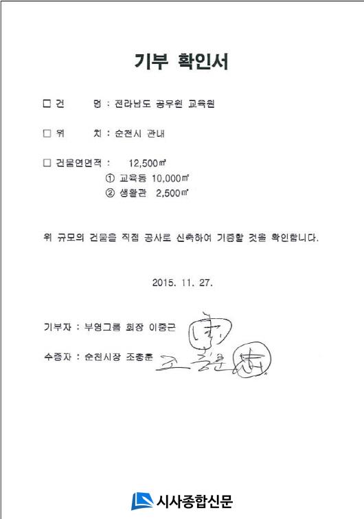 ÃÖ±Ù (ÁÖ)ºÎ¿µ±×·ì ÀÌÁ߱٠ȸÀåÀº °íÇâÀÎ ¼øÃµ½Ã¿¡ Àü³² °ø¹«¿ø ±³À°¿øÀÌ À¯Ä¡µÈ´Ù¸é, ±³À°¿ø ½Ã¼³(±³À°µ¿ 10,000§³, »ýȰ°ü 2,500§³) °ÇÃàºñ¿ë 250¿© ¾ï¿øÀ» ÅõÀÚÇÏ¿© Á÷Á¢ °Ç¸³ÇØ ¼øÃµ½Ã¿¡ ±âÁõÇϱâ·Î ¾à¼ÓÇß´Ù.