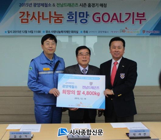 "°¨»ç³ª´® Èñ¸ÁGoal"À̶õ Ã౸¸¦ ÅëÇØ Èñ¸Á°ú ³ª´®ÀÇ Àǹ̸¦ µÇ»õ±â°í, °¨»ç³ª´® ½ÇõÀ» ÅëÇØ ÆÒ°ú Áö¿ª¹Îµé¿¡°Ô »ç¶û ¹Þ´Â ±¸´Ü, ÇູÀ» ÀüÇÏ´Â ±â¾÷ÀÌ µÇ±â À§ÇØ Àü³²µå·¡°ïÁî Ȩ°æ±â ½Ã °ñÀ» ³ÖÀ» ¶§ ¸¶´Ù Àü³²µå·¡°ïÁî°¡ ½Ò 100kgÀ», Æ÷½ºÄÚ ±¤¾çÁ¦Ã¶¼Ò°¡ ¸Åα׷£Æ® ¹æ½ÄÀ¸·Î Àû¸³ÇÏ¿© ¿¬¸»¿¡ ºÒ¿ìÀÌ¿ô¿¡°Ô ±âºÎÇÏ´Â Çà»ç·Î 2012³âºÎÅÍ ½Ç½ÃÇϰí ÀÖÀ¸¸ç, Àü³²µå·¡°ïÁî´Â ÇöÀç±îÁö 16,200kg¸¦ ±¤¾ç½Ã »ç¶û³ª´® º¹ÁöÀç´Ü¿¡ ±âºÎÇß´Ù.