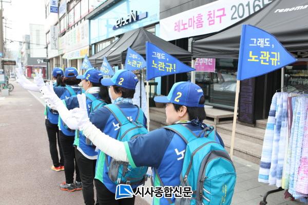 [¼øÃµ/½Ã»çÁ¾ÇսŹ®]¿ÀÁ¤±Ù ±âÀÚ = 20´ë ÃѼ± °ø½Ä ¼±°Å¿îµ¿ÀÌ ½ÃÀÛµÈ 31ÀÏ Ã¹ ³¯ ´õºÒ¾î¹ÎÁÖ´ç ³ë°ü±Ô Èĺ¸ÀÇ ¼±°Å¿îµ¿¿øµéÀÌ ÆÄ¶õº£³¶¿¡ ¡®±×·¡µµ ³ë°ü±Ô¡¯¶ó´Â »ï°¢±ê¹ßÀ» ²Å°í À¯±ÇÀÚµéÀÇ ´«±æÀ» ²ø°í ÀÖ´Ù.