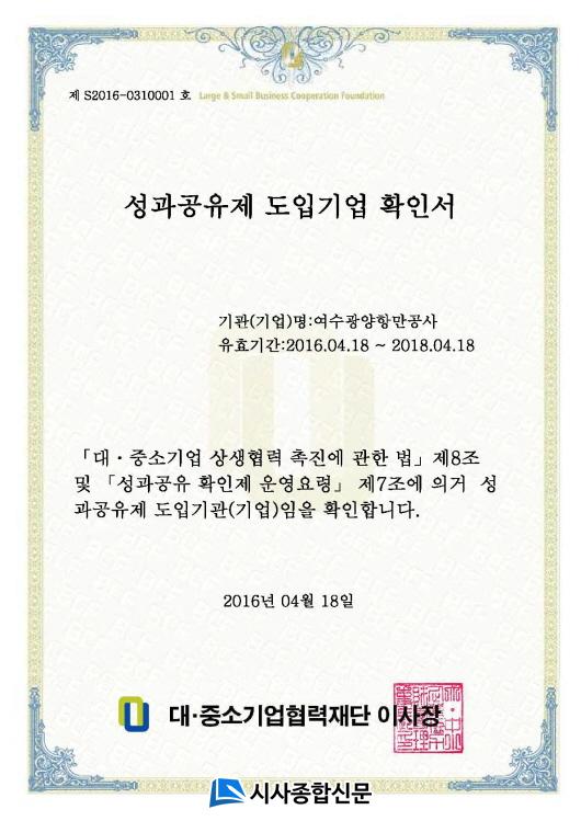 ¿©¼ö±¤¾çÇ׸¸°ø»ç´Â ¿ÃÇØ¸¦ ¼º°ú°øÀ¯Á¦ µµÀÔ ¿ø³âÀ¸·Î »ï´Â´Ù´Â ¸ñÇ¥ ¾Æ·¡ Áö³ÇØ 12¿ùºÎÅÍ ¼º°ú°øÀ¯Á¦ µµÀÔ±â¾÷ ÀÎÁõÀ» ÃßÁøÇØ ¿ÔÀ¸¸ç, Áö³ 3¿ù¿¡´Â ¼º°ú°øÀ¯Á¦ ½ÃÇà ÁöħÀ» ¸¶·ÃÇÑ ¹Ù ÀÖÀ¸¸ç, ¼º°ú°øÀ¯Á¦´Â ¿ÃÇØ °ø»çÀÇ µ¿¹Ý¼ºÀå ÁßÁ¡ ÃßÁø°úÁ¦ Áß Çϳª·Î ´ë±â¾÷°ú Áß¼Ò±â¾÷°£ °øµ¿ÀÇ ¸ñÇ¥¸¦ ¹Ì¸® ¾à¼ÓÇÏ°í ³ë·ÂÀ» ÅõÀÔÇØ °ÅµÐ ¼º°ú¸¦ »çÀü¿¡ Á¤ÇØÁø ¹æ¹ýÀ¸·Î ³ª´©´Â Á¦µµ·Î, ±â¾÷ ³×Æ®¿öÅ© ÀüüÀÇ °æÀï·ÂÀ» ³ôÀÌ´Â ´ëÇ¥ÀûÀÎ µ¿¹Ý¼ºÀå ÇÁ·Î±×·¥À¸·Î, ¼º°ú°øÀ¯Á¦ µµÀÔ±â°ü ÀÎÁõÀº ¼º°ú°øÀ¯ °úÁ¦¸¦ ¹ß±¼ÇÏ°í ±× °úÁ¦ ¹× ÃßÁø ³»¿ëÀÌ ÀûÇÕÇÏ´Ù°í ÆÇ´ÜµÇ¸é ´ëÁß¼Ò±â¾÷Çù·ÂÀç´ÜÀÌ À̸¦ È®ÀÎÇÏ°í ºÎ¿©ÇÏ°Ô µÈ´Ù.