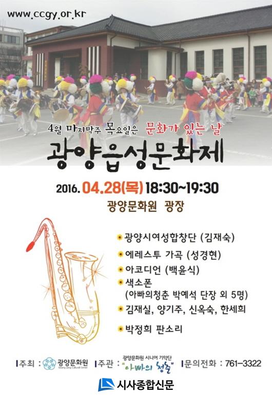 ±¤¾ç¹®È¿øÀÌ ÁÖÃÖÇÏ°í ±¤¾ç¹®È¿ø ½Ã´Ï¾î ±â¾Ç´Ü ¾ÆºüÀÇ Ã»ÃáÀÌ ÁÖ°üÇÏ´Â À̹ø ±¤¾çÀ¾¼º¹®ÈÁ¦´Â Àü³âµµ¿¡´Â ¼ö¿äÀÏ¿¡ °³ÃÖÇÏ´ø °ÍÀ» ¸Å¿ù ¸¶Áö¸· ÁÖ ¸ñ¿äÀÏ¿¡ °³ÃÖÇÑ´Ù, À̳¯ Çà»ç´Â ¼ø¼ö ¹®È¿ø ȸ¿øÀ¸·Î ±¸¼ºµÈ ±¤¾ç½Ã ¿©¼ºÇÕâ´Ü(±èÀç¼÷), ¿¡·¹½ºÅõ °¡°î(¼º°æÇö), ¾ÆÄÚµð¾ð(¹éÀ±½Ä), »ö¼ÒÆù(¹Ú¿¹¼®´ÜÀå ¿Ü 5¸í), ±èÀç½Ç, ¾ç±âÁÖ, ½Å¿Á¼÷, ÇѼ¼Èñ, ¹ÚÁ¤Èñ ÆÇ¼Ò¸® °ø¿¬ µîÀÌ ¿¹Á¤µÇ¾î ÀÖ´Ù.